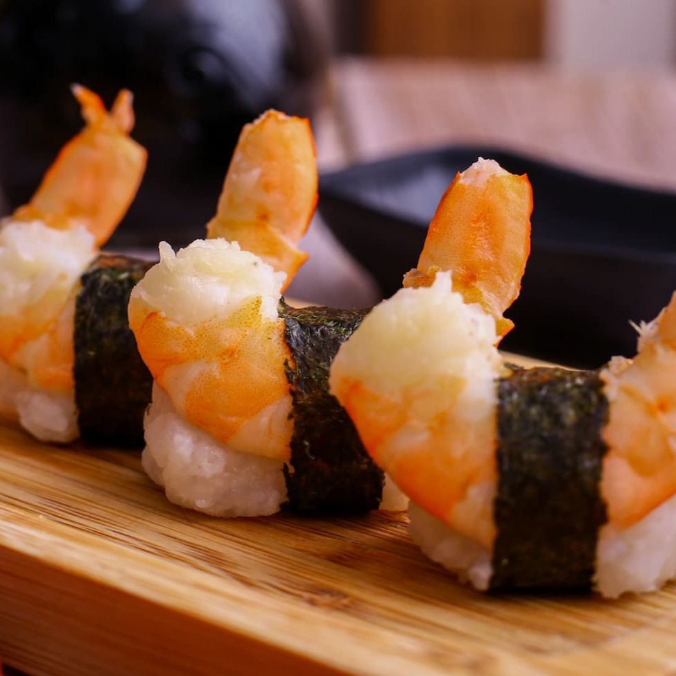 Sushi de camarão recheado com arroz e finalizado com uma delicada tira de nori.