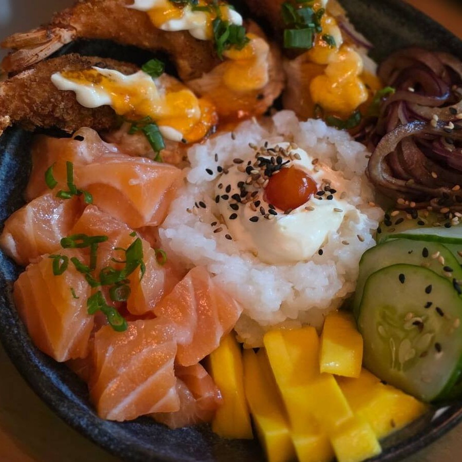 Arroz, manga, pepino japonês, cebola roxa marinada, cream cheese, salmão e gergelim.