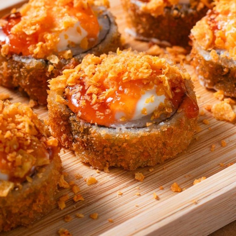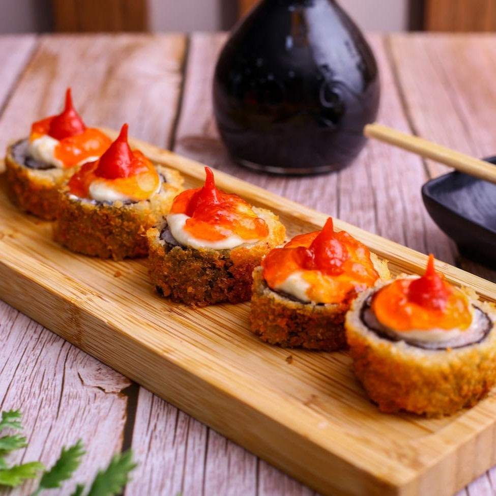 Rolinho empanado e frito, com arroz temperado e alga nori, recheado com cream cheese e sabor à escolha, finalizado com geleia de pimenta e Doritos.