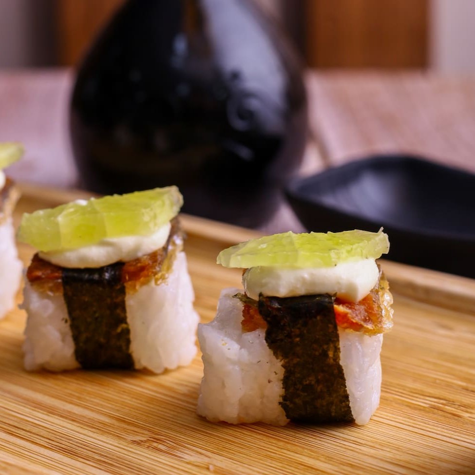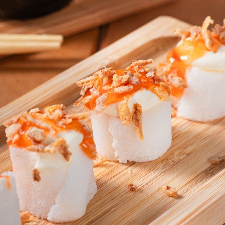 Sushi de tapioca com sabor à escolha, finalizado com geleia de pimenta e cebola crispy.