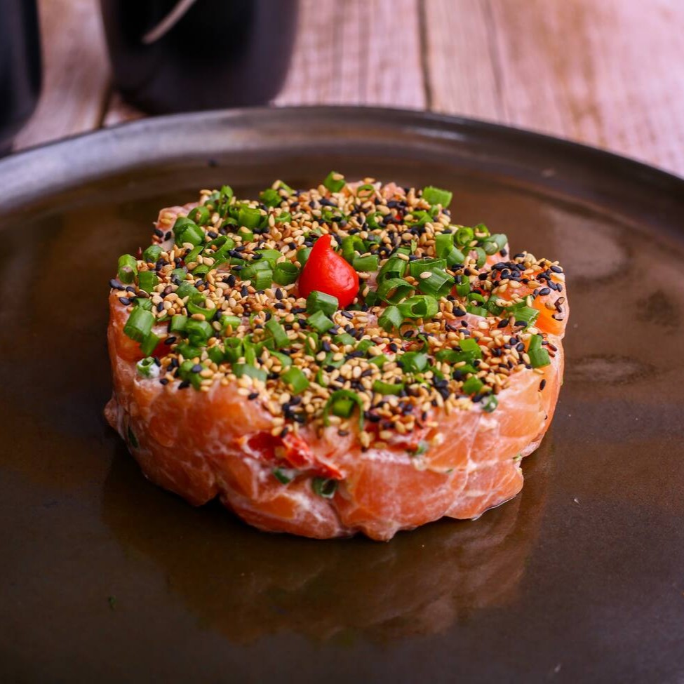 Tartar de salmão fresco com cream cheese e cebolinha, finalizado com gergelim.