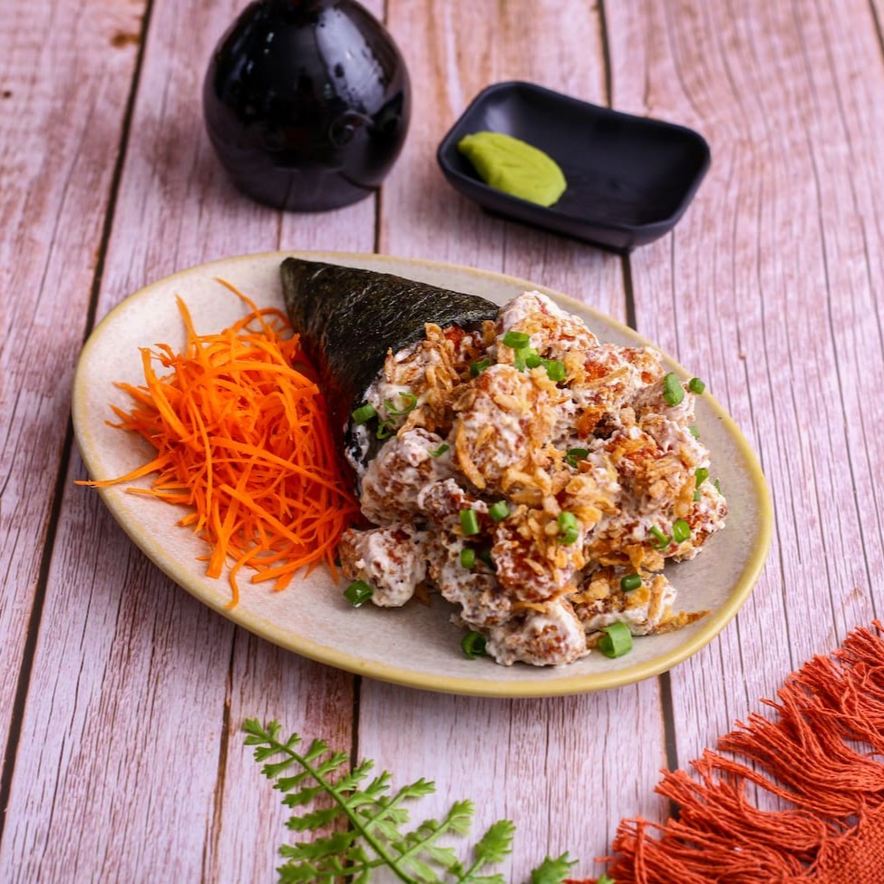 Cone de alga nori recheado com arroz temperado, kani empanado e cream cheese