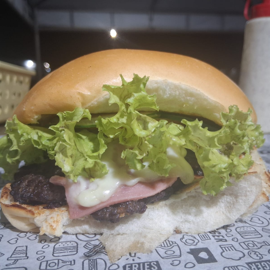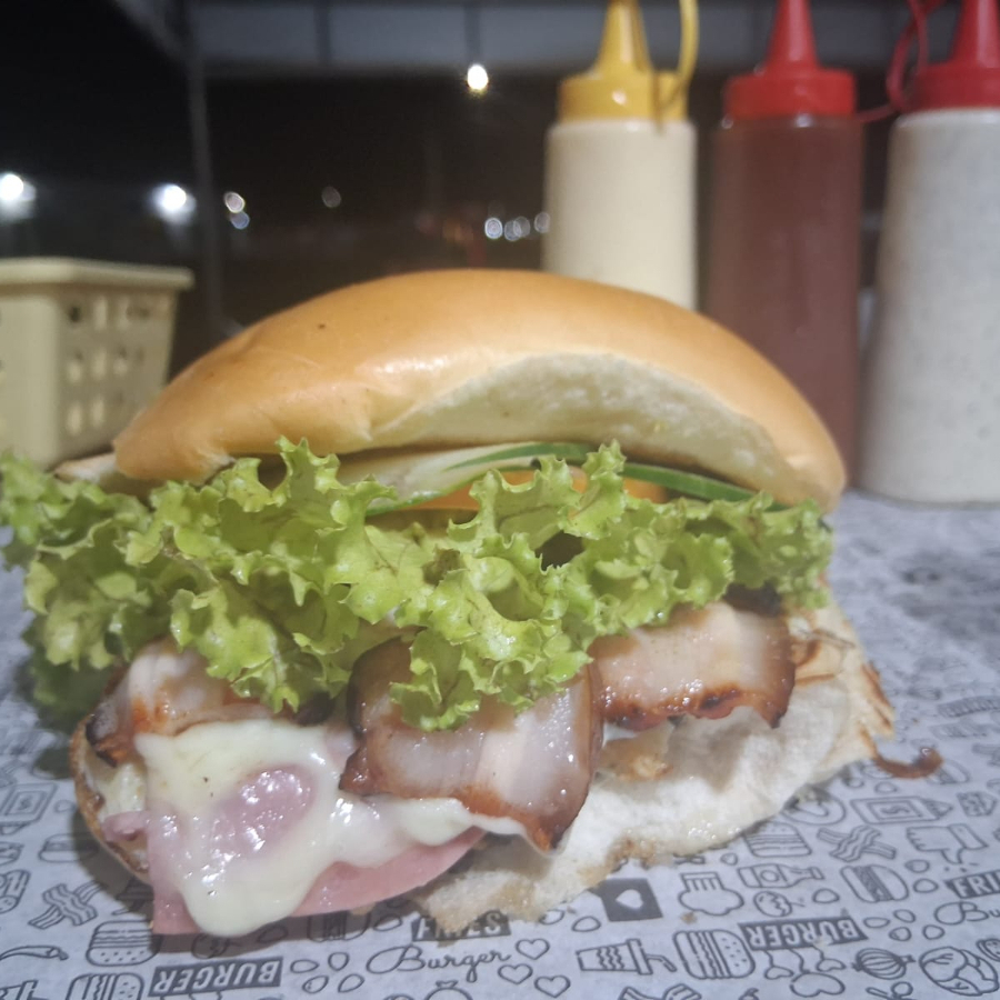Pão, 2 carnes, ovo, queijo, presunto, pepino, tomate, alface, batata palha.