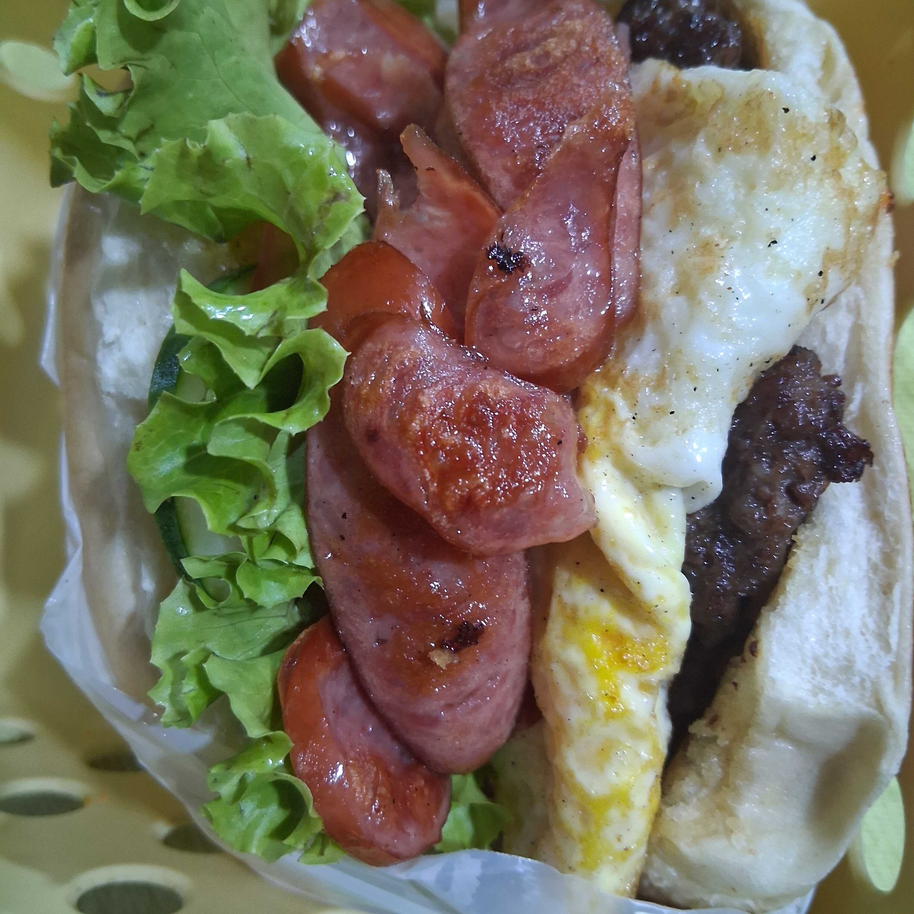 Pão, carne, ovo, queijo, presunto, calabresa, bacon, pepino, tomate, alface, batata palha.