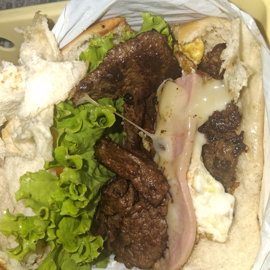 Pão, 2 carnes, 2 ovos, queijo, presunto, calabresa, pepino, tomate, alface, batata palha.