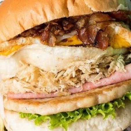 Pão, carne, ovo, frango, bacon, calabresa, filé, presunto, queijo e salada
