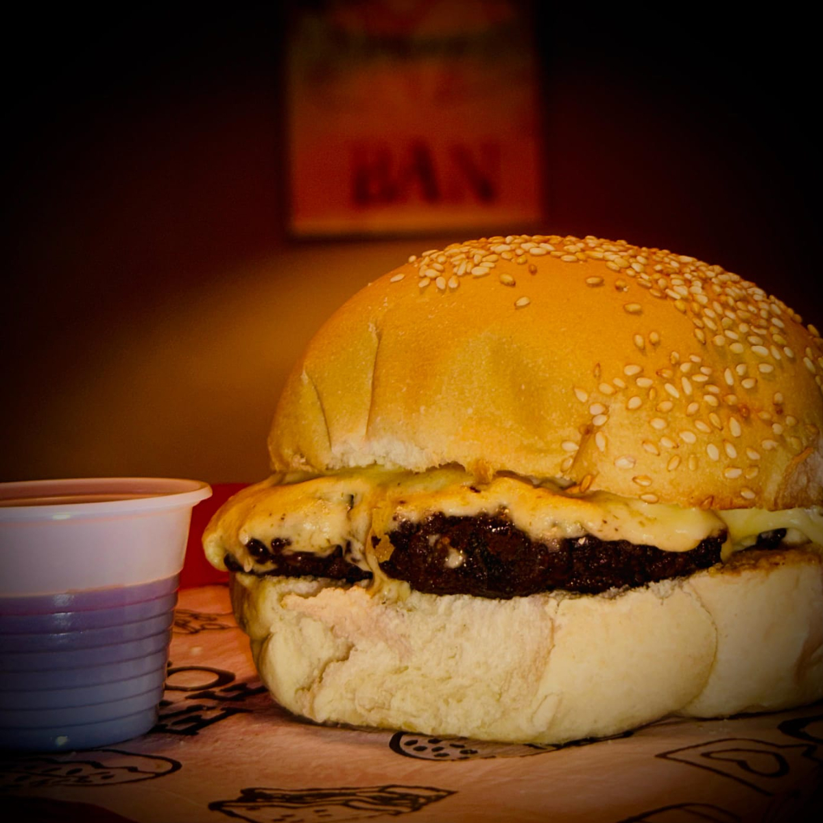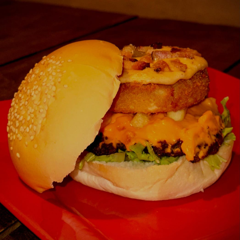 Pão, Salada, Bacon, Molho Cebola Caramelizada, Molho Geleia de Pimenta, Carne 150g, Molho Cheddar, Molho Geleia de Pimenta. ACOMPANHA: MOLHO BARBECUE