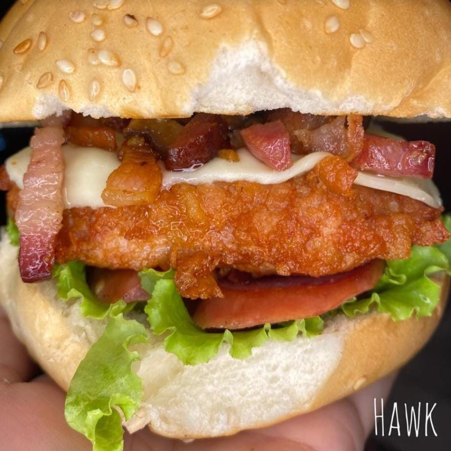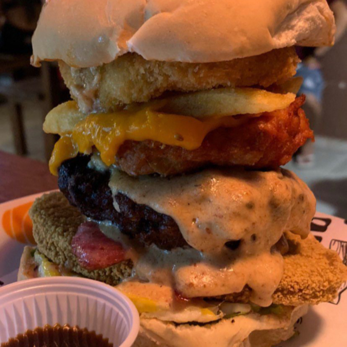 Pão, Salada, Ovo, Carne 150g, Frango, Molho Baconese. ACOMPANHA MOLHO BARBECUE