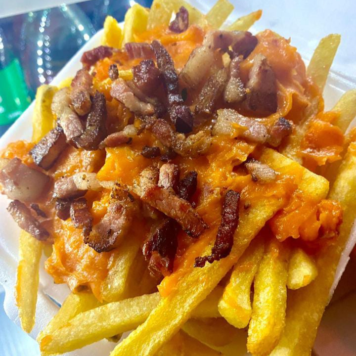 Pão de Hot, 2 Fatia de Queijo, 2 Batata Fritas, Calabresa Mista, Molho Cheddar, Bacon. ACOMPANHA: MOLHO BARBECUE