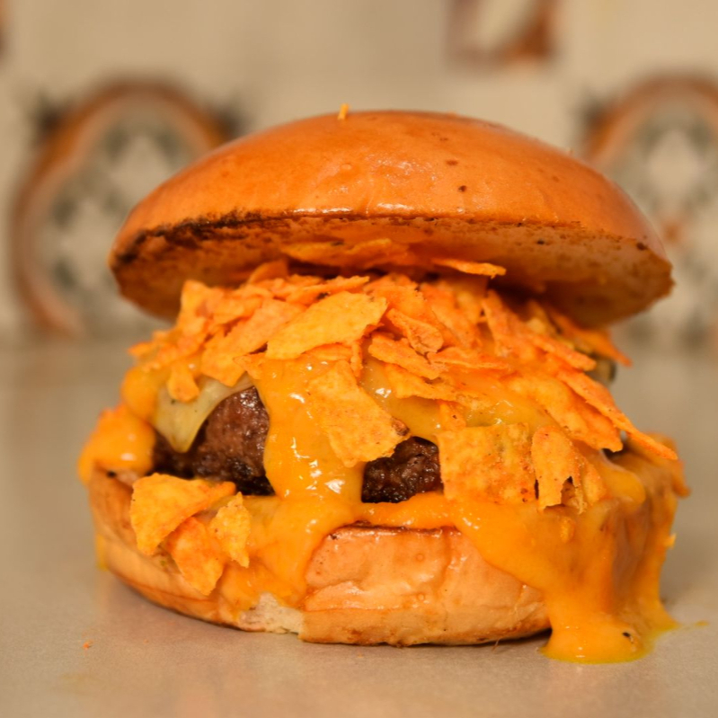 PÃO BRIOCHE COM GERGELMI, BLEND DE FRALDINHA 150G, CHEETOS E CHEEDAR CREMOSO.