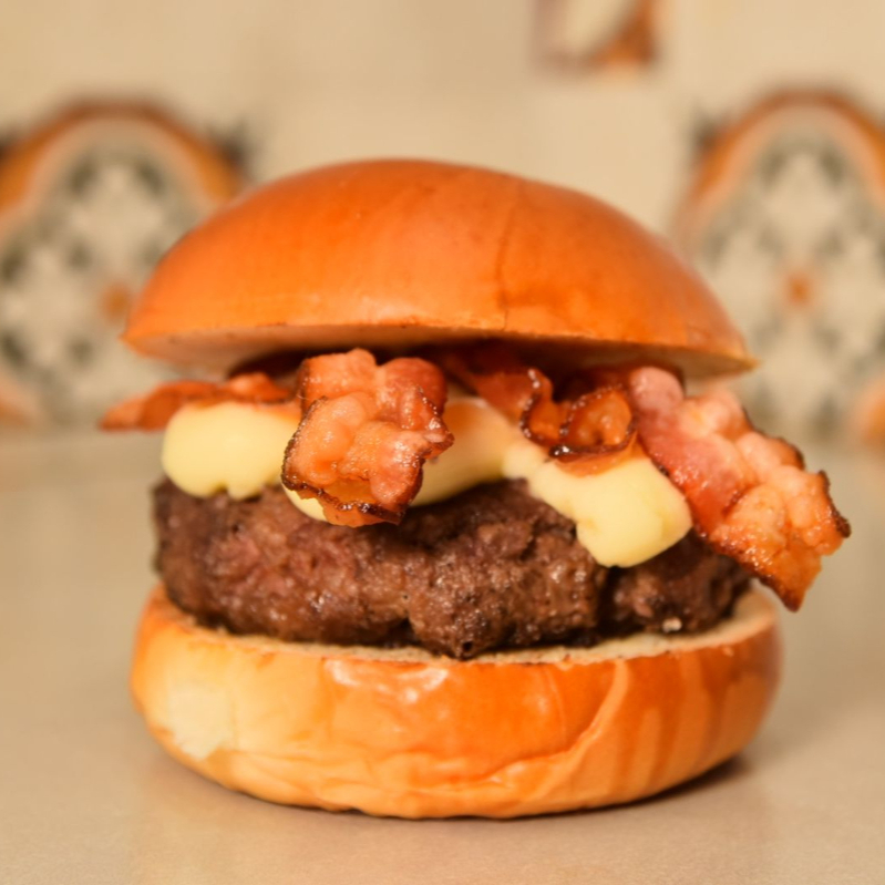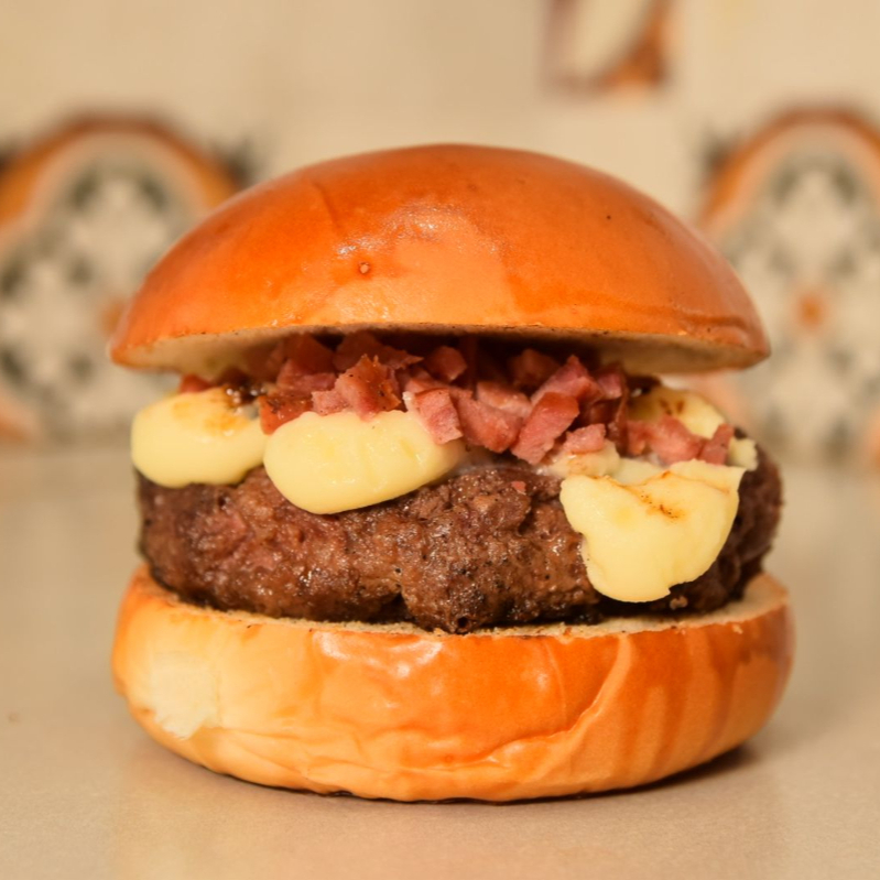 PÃO BRIOCHE COM GERGELMI, BLEND DE FRALDINHA 150G, BACON, MOLHO DE REQUEIJAODA CASA.