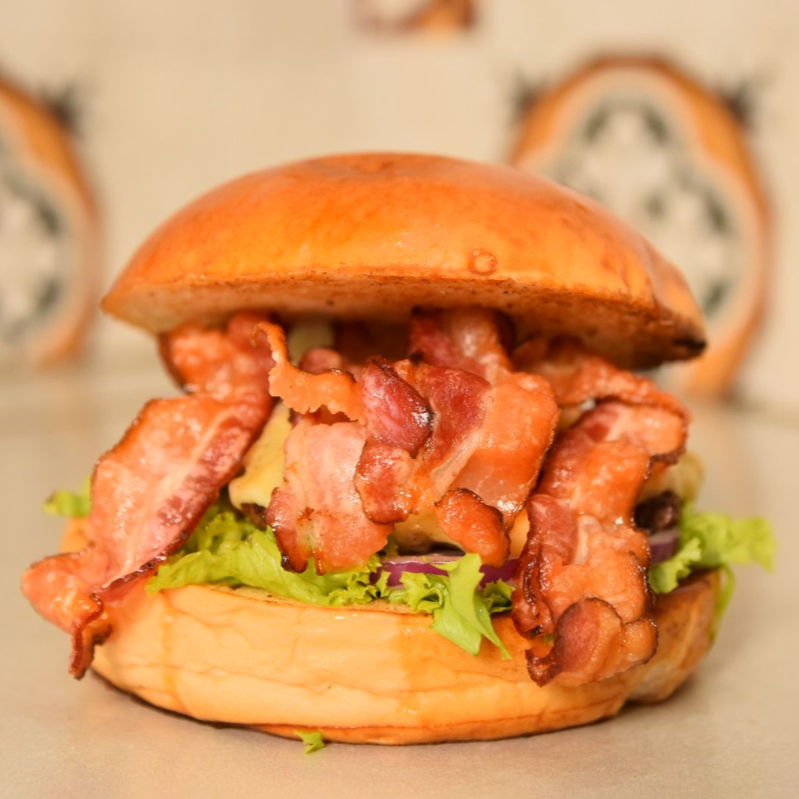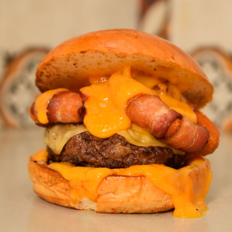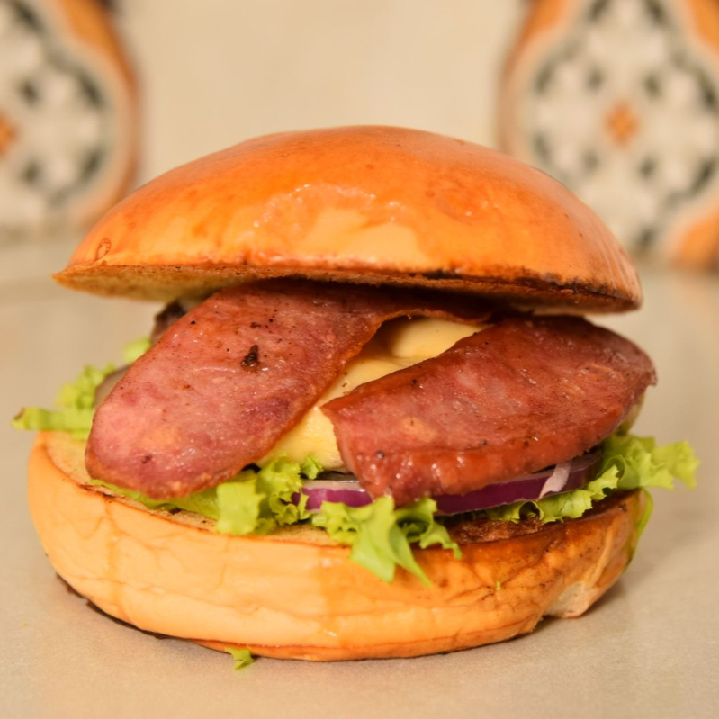 PÃO BRIOCHE COM GERGELIM, CARNE 100G FRALDINHA, BACON, QUEIJO CHEEDAR, MOLHО DE ALHO, ALFACE, CEBOLA E TOMATE.