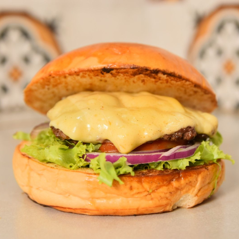 PAO BRIOCHE COM GERGELIM, CARNE 100G FRALDINHA E MOLHO DE CHEEDAR.