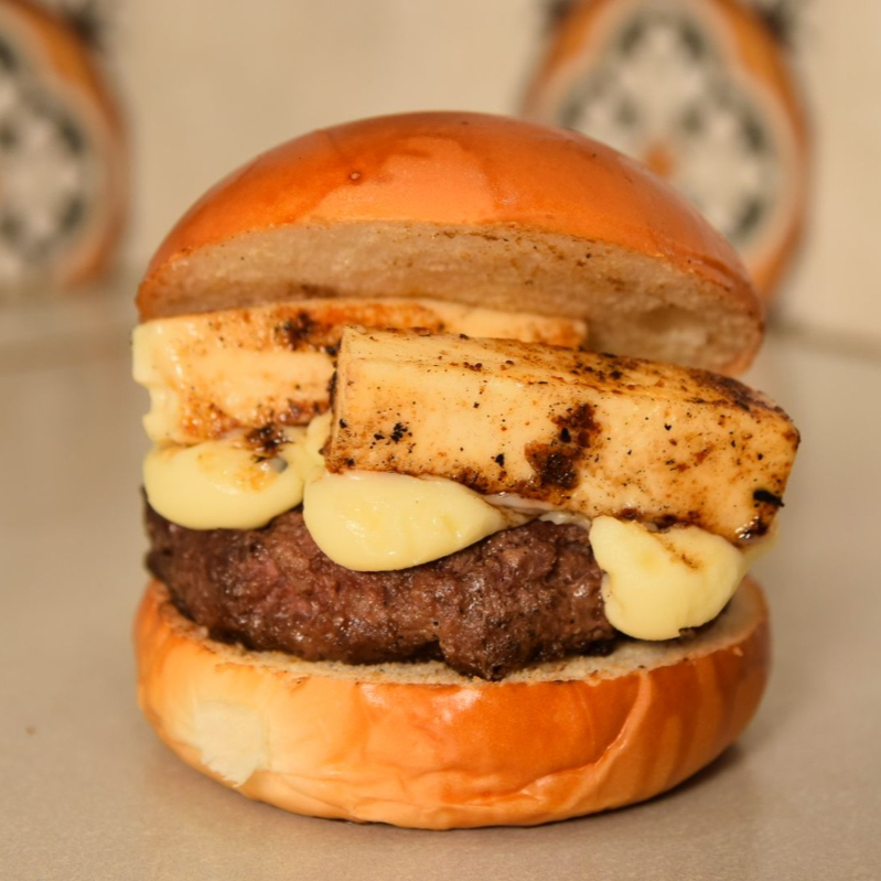 PÃO BRIOCHE COM GERGELMI, BLEND DE FRALDINHA 150G, QUEIJO COALHO ASSADO E REQUEIJÄO DA CASA.