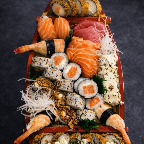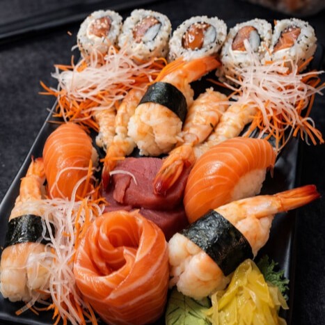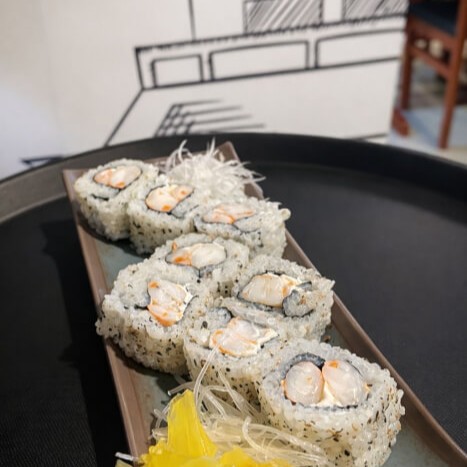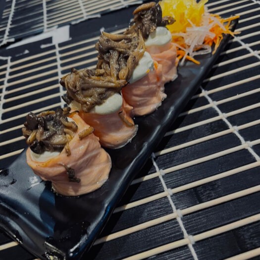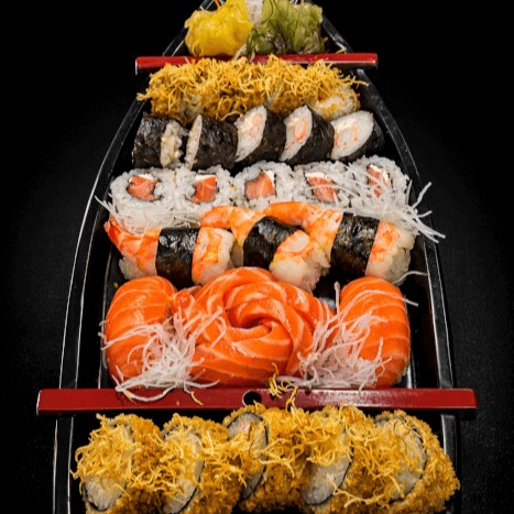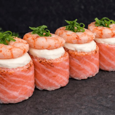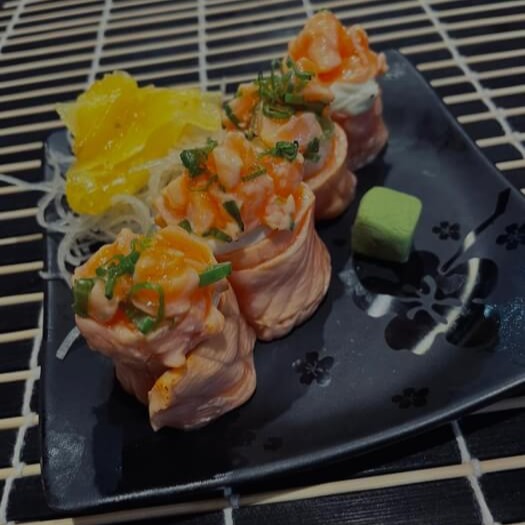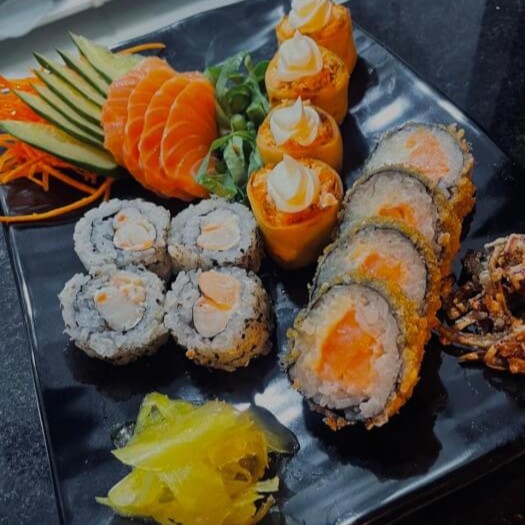 Combinação especial da casa com salmão, camarão, cream cheese, alga nori, gergelim e molhos exclusivos.