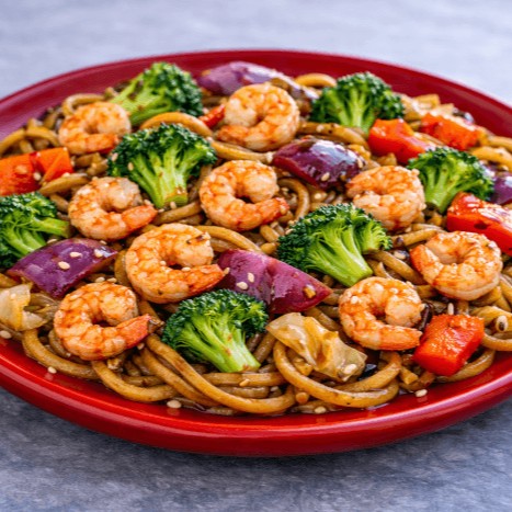 Arroz japonês com camarão cozido disposto por cima.