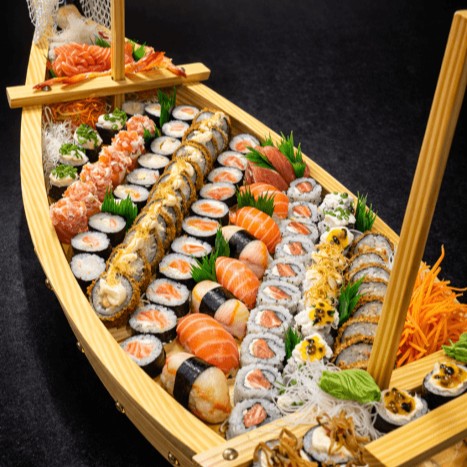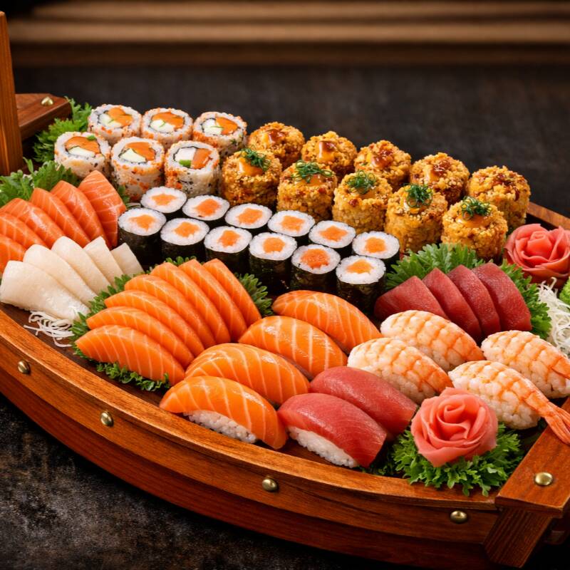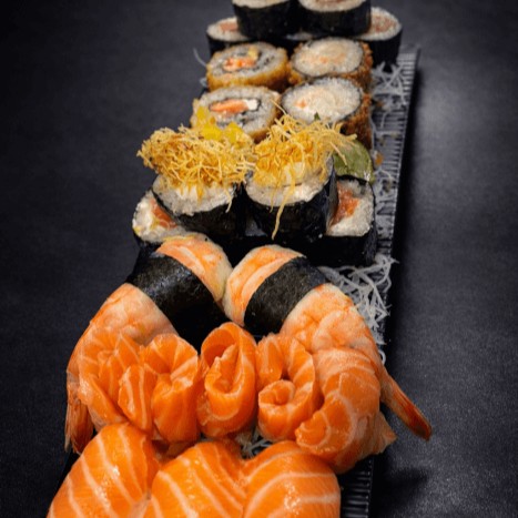 10 hot salmão, 10 hot filadélfia, 10 uramaki salmão, 10 uramaki camarão, 10 hossomaki salmão, 10 hossomaki camarão, 10 niguris variados, 10 sashimi variados, 5 joy (gukan) de salmão, 5 uramaki, 5 hossomaki skin, 5 califórnia.