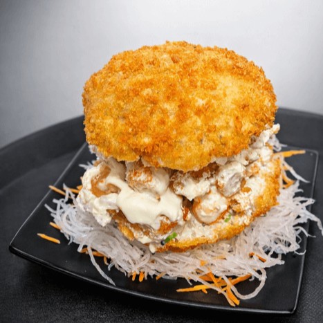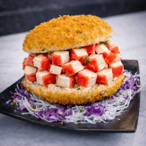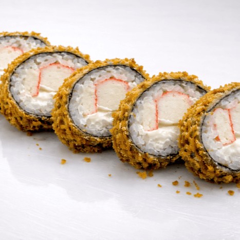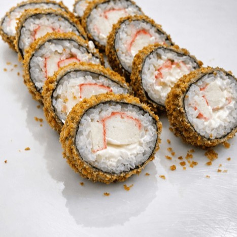 Rolinho empanado com kani, arroz, alga nori e cream cheese.