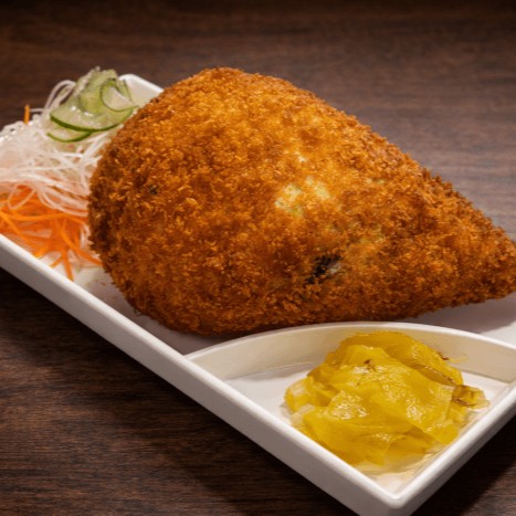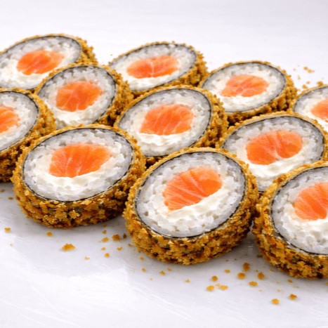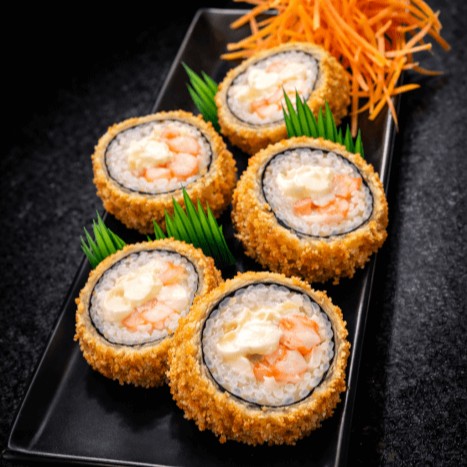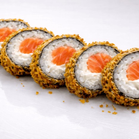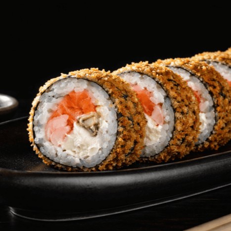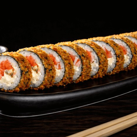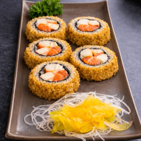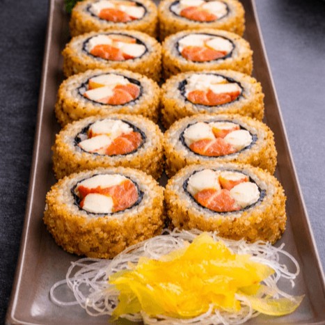 Rolinho de arroz, alga nori, salmão e cream cheese, empanado em panko e frito.