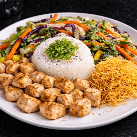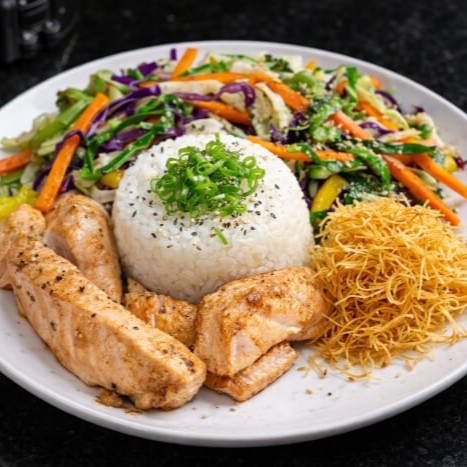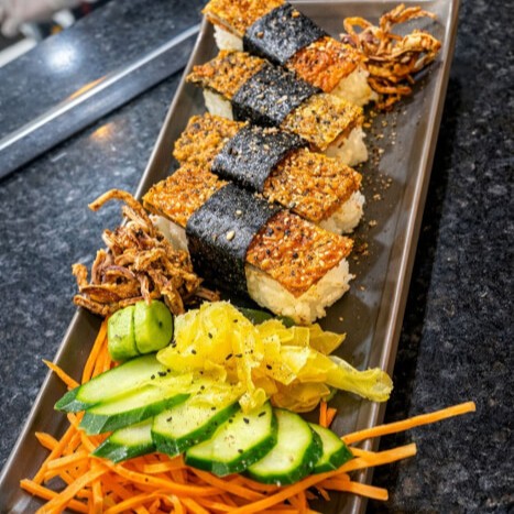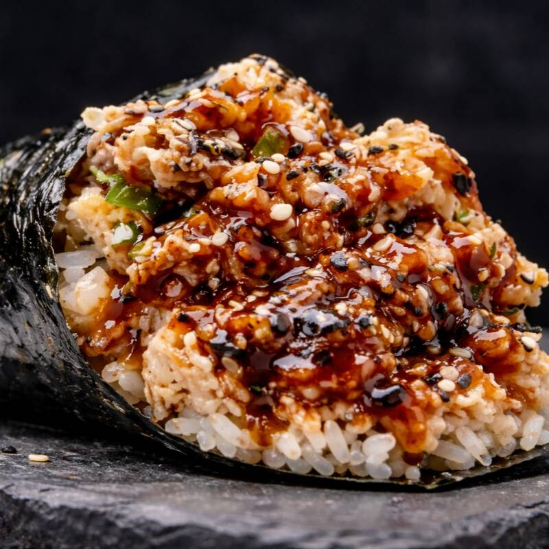 Arroz japonês coberto com pele de salmão grelhada, crocante e finalizada com gergelim.