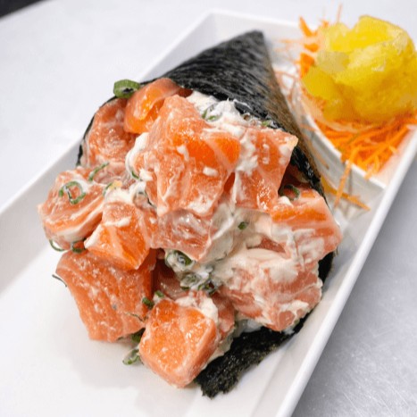 Base de arroz envolta em alga nori, coberta com tartar de salmão e cream cheese.