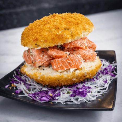 Bolinhos de arroz japonês com salmão picado, cream cheese, cebolinha e temperos, empanados e fritos.