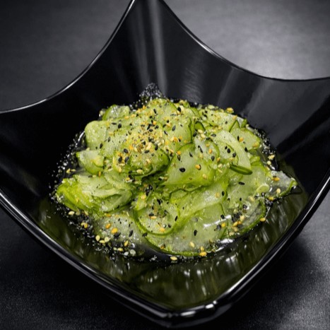 Pepino japonês fatiado, molho agridoce à base de vinagre de arroz, açúcar, shoyu suave e gergelim.