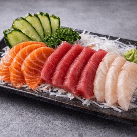 Pepino fatiado, molho agridoce com vinagre de arroz, açúcar, shoyu e gergelim e kani, salmão e camarão