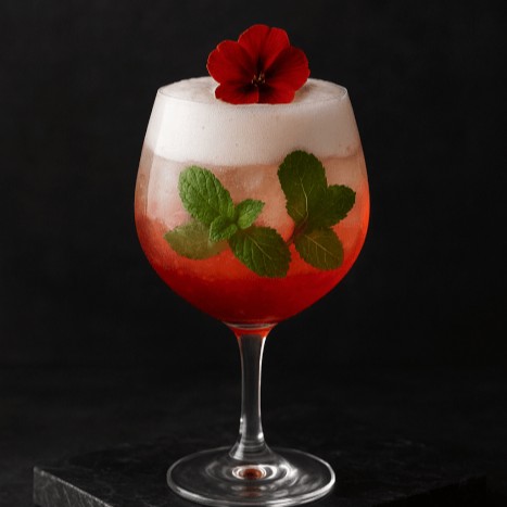 Xarope de morango, hortelã, limão, gin e espuma de limão
