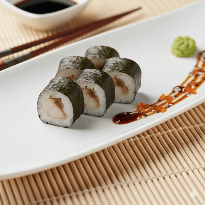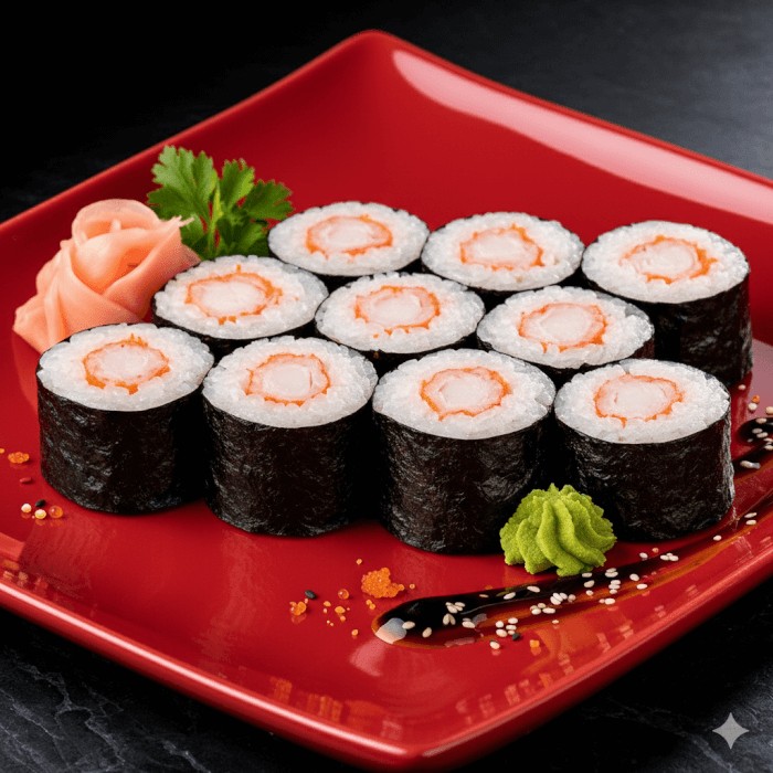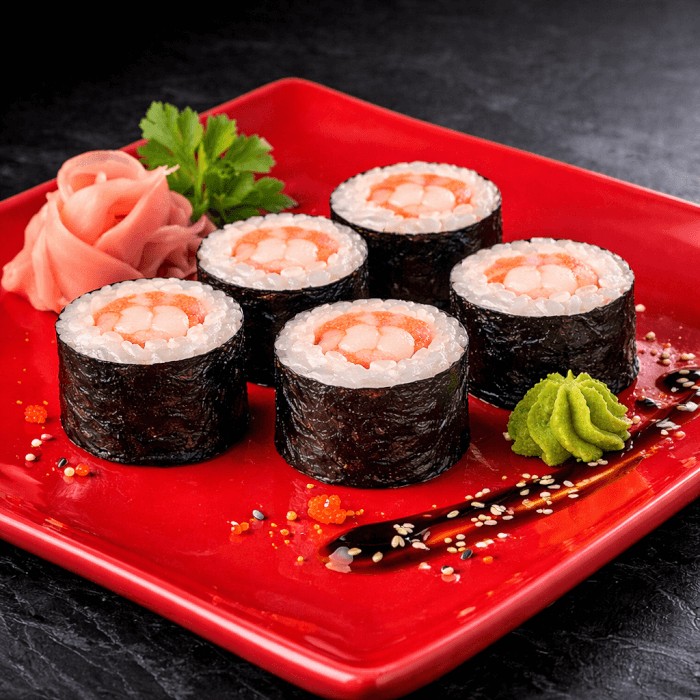 Rolinhos finos de arroz e camarão, envoltos em alga nori.