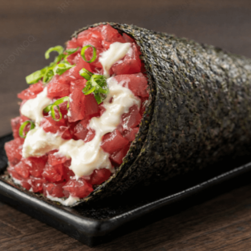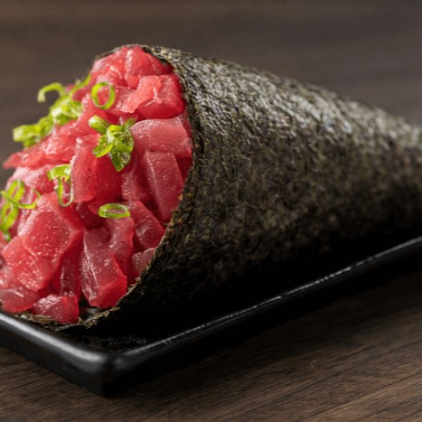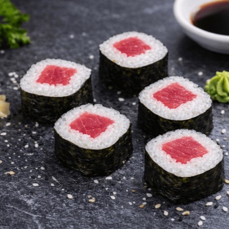 Arroz japonês e atum fresco enrolados em alga nori.
