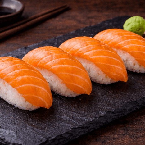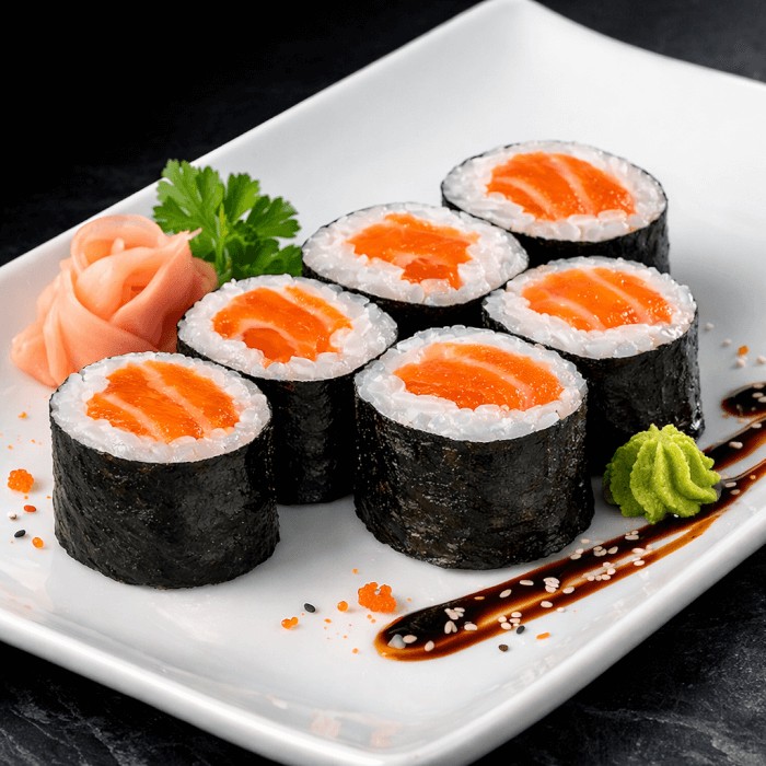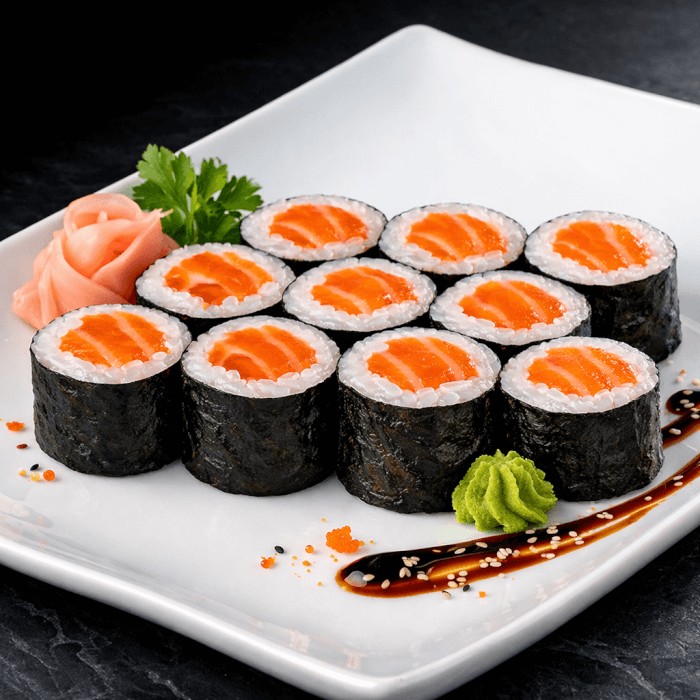 Rolinhos finos de arroz japonês e salmão fresco envoltos em alga nori.