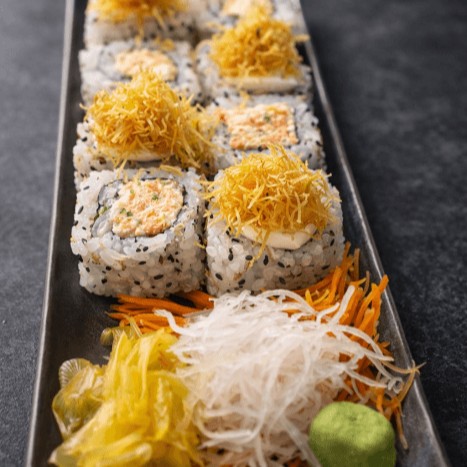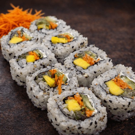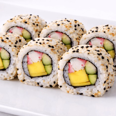 Arroz por fora, recheio de kani, pepino, manga, maionese japonesa e alga nori.