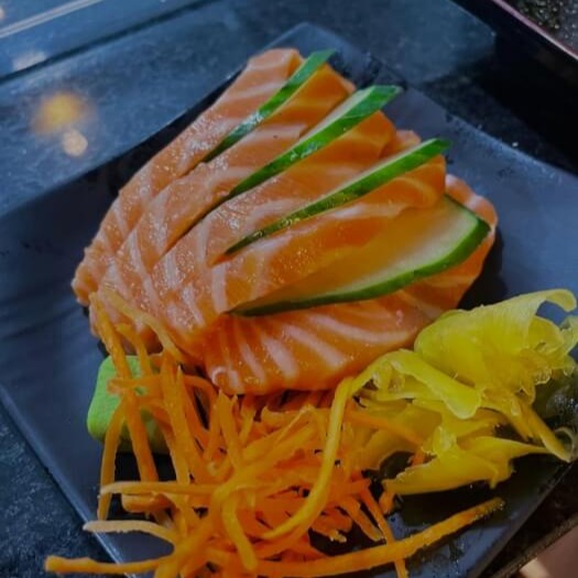 Fatias finas de salmão cru com molho cítrico de shoyu, limão, azeite, gergelim e cebolinha.