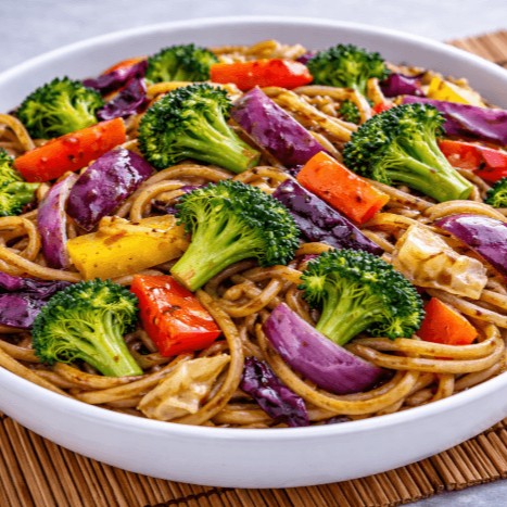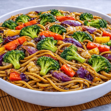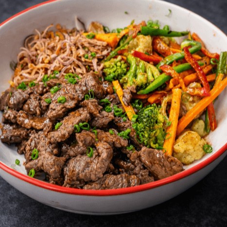 Carne bovina, com uma variedade de legumes frescos grelhados em uma chapa.