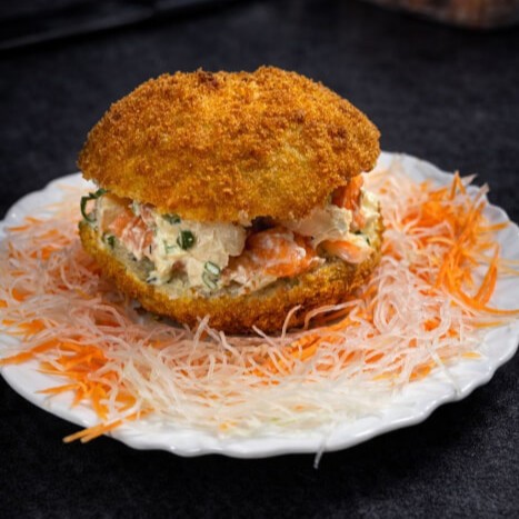 Camarões empanados na farinha panko, recheado com queijo mussarela e cream cheese.