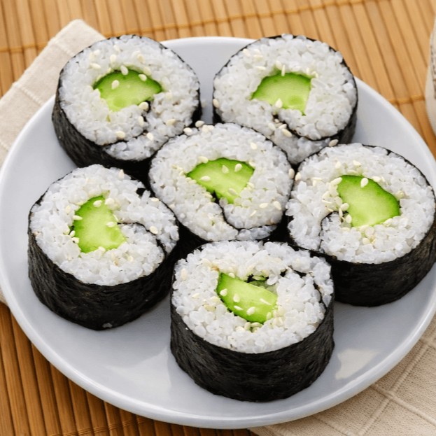 Rolinhos leves de arroz japonês com tiras de pepino fresco.