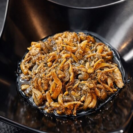 Cogumelo shimeji salteado na manteiga com shoyu, com kani, finalizado com cebolinha e gergelim.