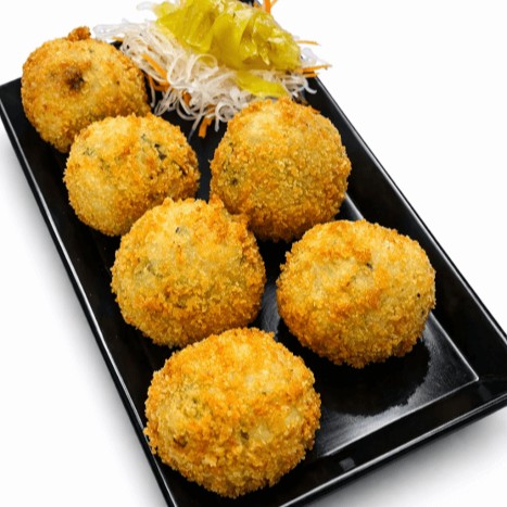 Bolinhos de arroz japonês com camarão picado, cream cheese, cebolinha e temperos, empanados e fritos.