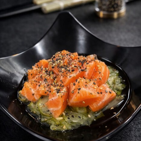 Pepino fatiado, molho agridoce com vinagre de arroz, açúcar, shoyu e gergelim e kani e salmão
