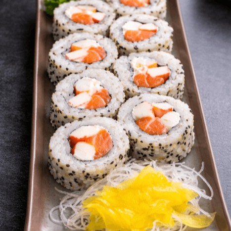 Rolinho invertido com arroz por fora, recheado com salmão fresco e cream cheese, envolto em alga nori e gergelim.