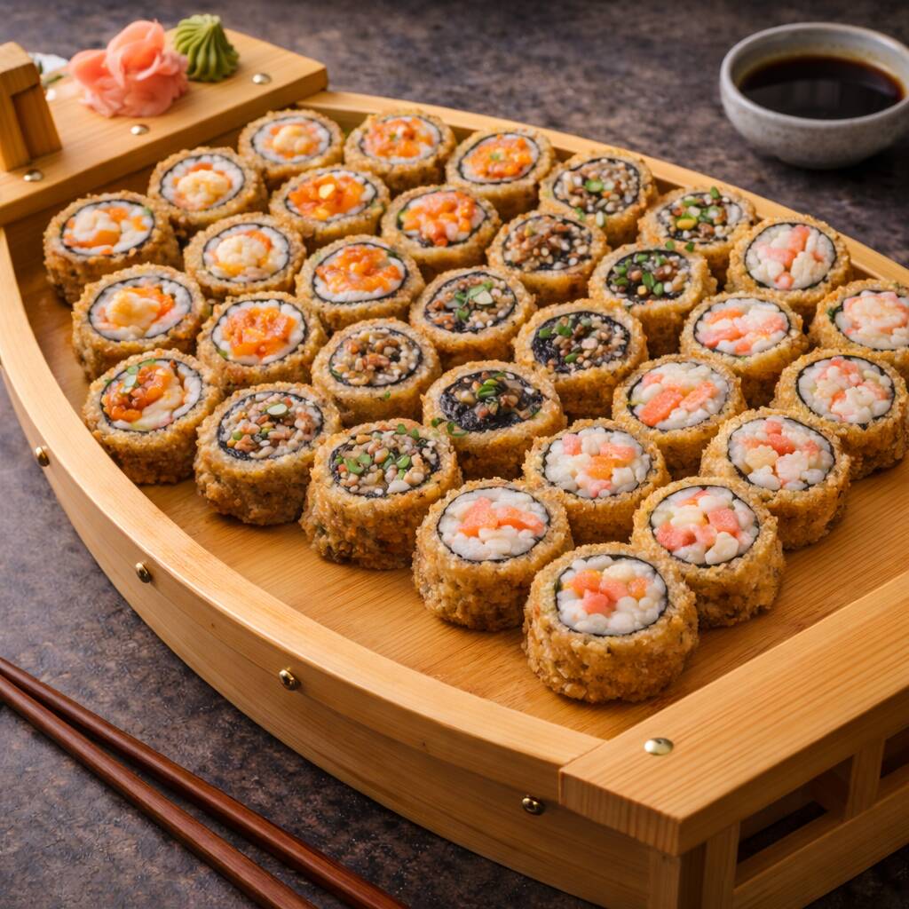 Mix de rolinhos empanados com salmão e kani