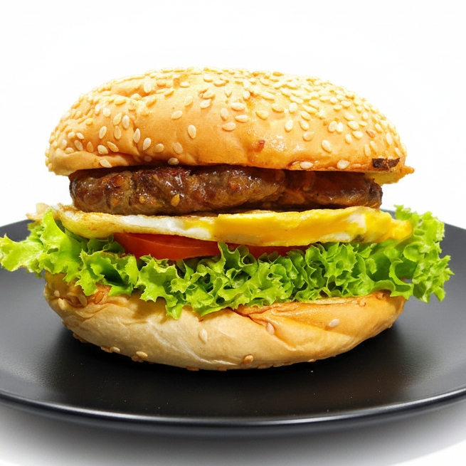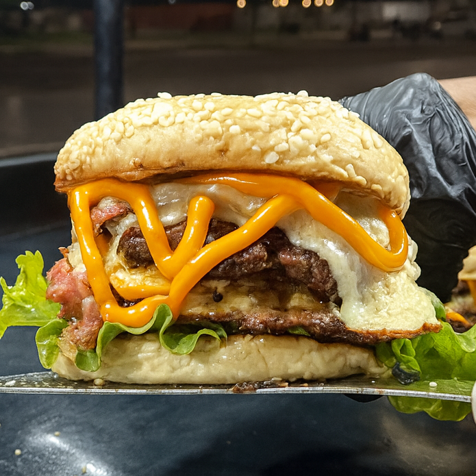 tudo em dobro pra você se deliciar Pão,duas carnes, dois ovos, dois queijos, dois presuntos e cheddar e salada de alface e pepino