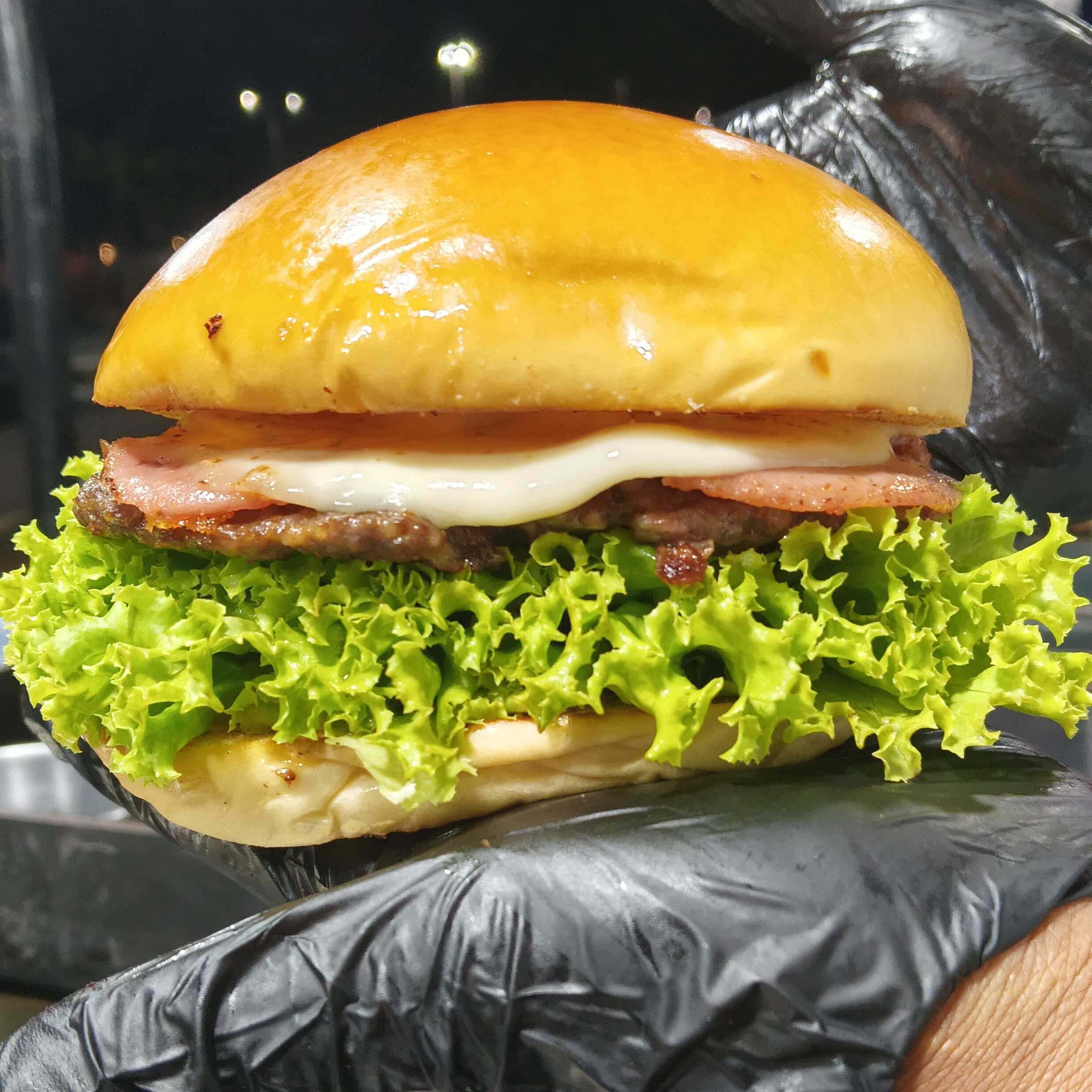 Pão, carne,calabresa, bacon, cebola, caramelizada,cheddar, barbecue, queijo,e presunto e alface e pepino
