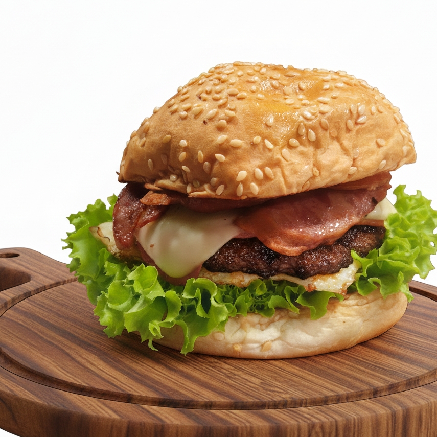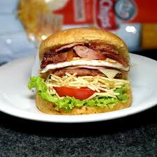 Pão, carne,queijo, presunto, bacon,barbecue, alface e pepino