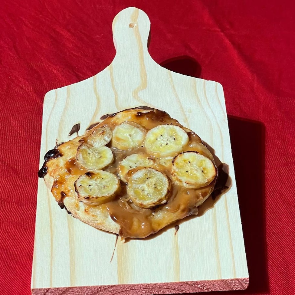 Esfiha recheada do melhor doce de leite aquela banana docinha e cortada na hora só para ficar ainda mais gostoso.