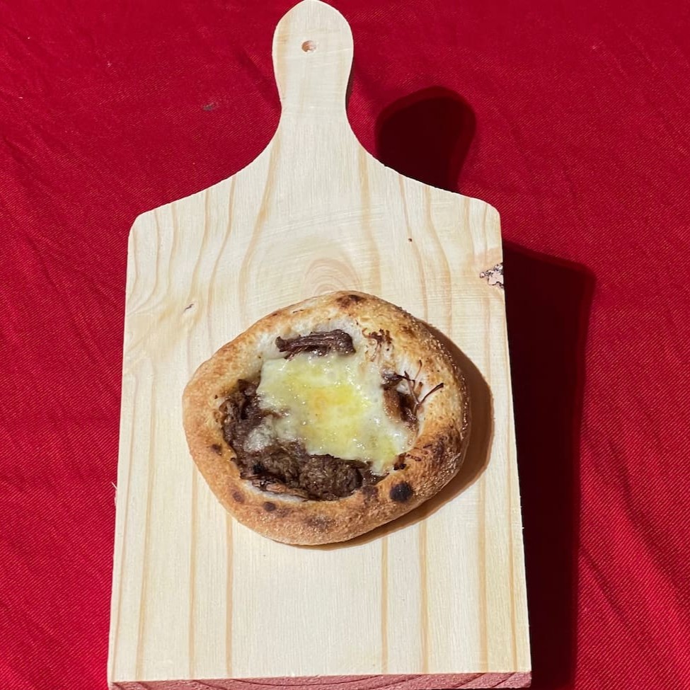 Esfiha recheada de carne desfiada e queijo mozarela.