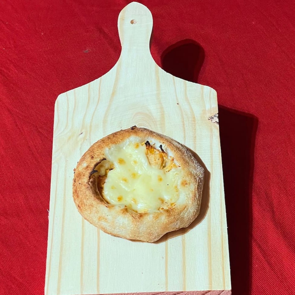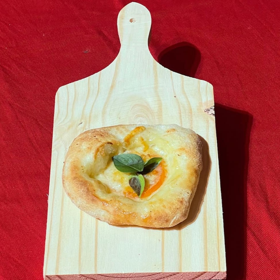 Esfiha recheada com queijo mozarela, tomate, parmesão e manjericão.