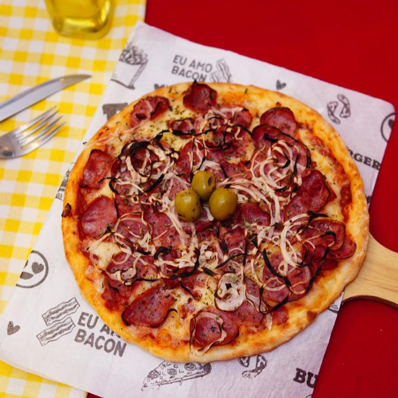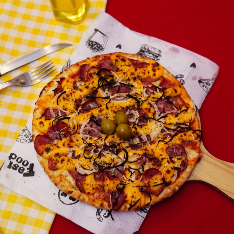 Pizza de calabresa com molho de tomate, queijo mussarela, calabresa fatiada, cebola, azeitona e orégano. Um combo com pizza grande 12 fatias e mais um delicioso Guaraná 1l