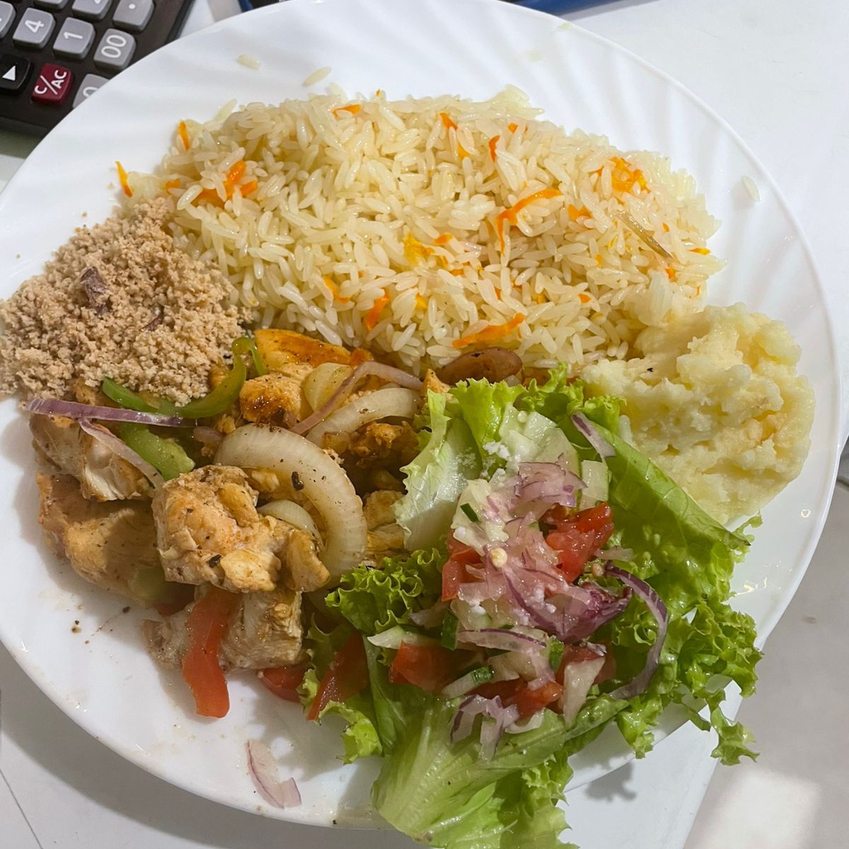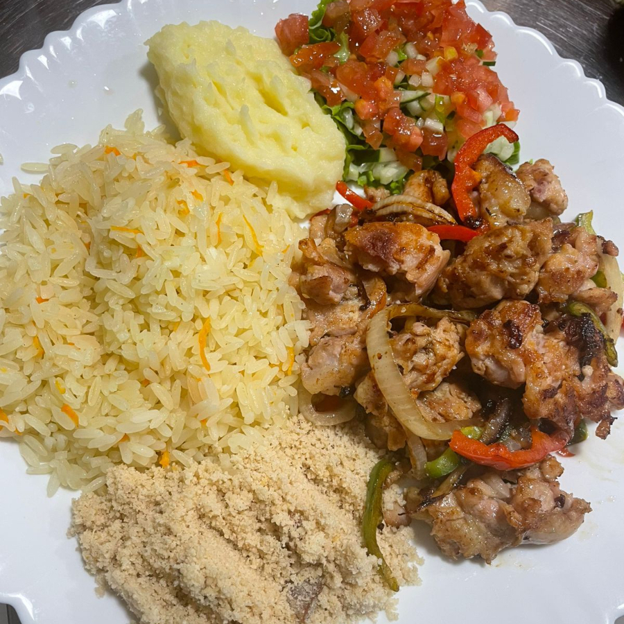 Arroz, Purê, Farofa, salada e legumes